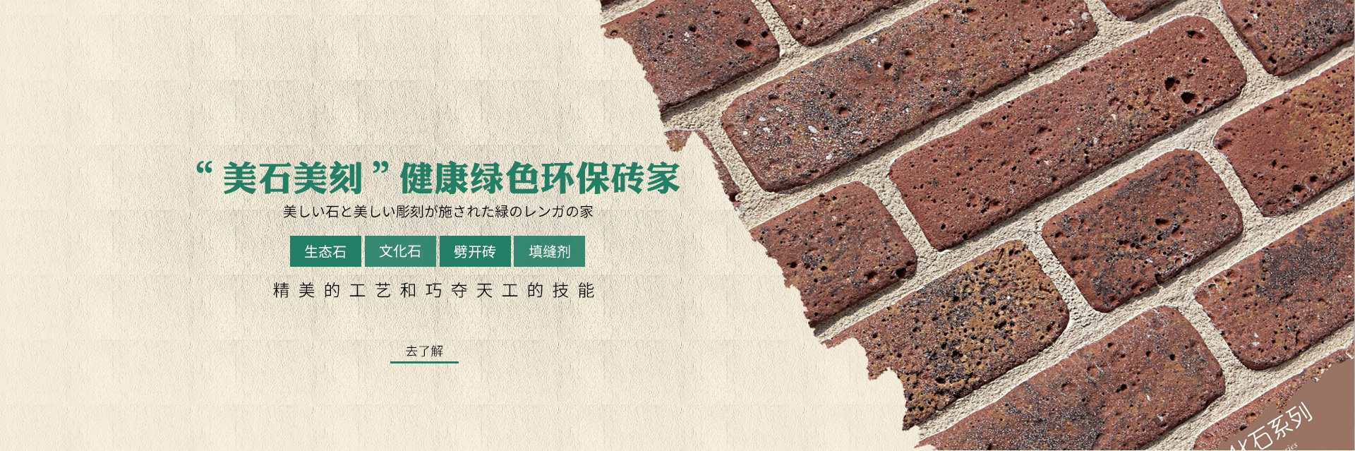 美石美刻坐落于晉江陶瓷產(chǎn)業(yè)基地,是一家專(zhuān)業(yè)研發(fā)、生產(chǎn)、設(shè)計(jì)、制造為一體的文化石、劈開(kāi)磚、仿古磚、生態(tài)石、整體一墻磚飾面砌塊的大型生產(chǎn)型企業(yè),由多位長(zhǎng)達(dá)十幾年以上從事文化藝術(shù)石的民間工藝美術(shù)師和硅酸鹽專(zhuān)業(yè)工程師共同成立的一家專(zhuān)家級(jí)綜合性企業(yè),其中:專(zhuān)家級(jí)5位,工程師8位,核心技術(shù)人才60人,員工總數(shù)為1000人。