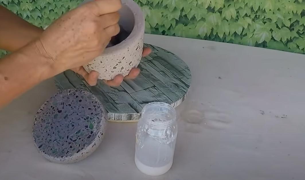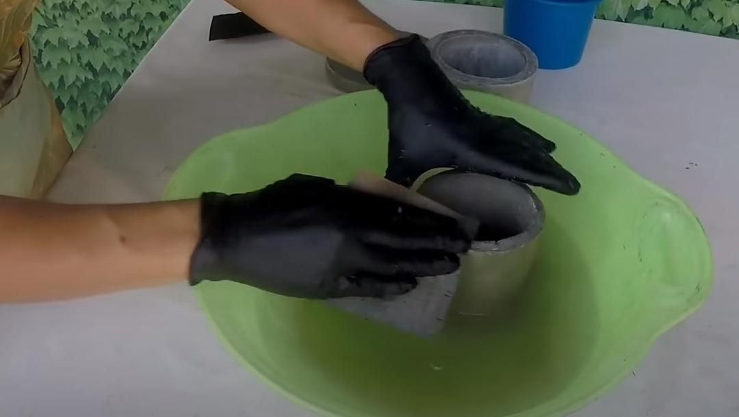 將成型的花盆從模型里拿出來,這樣花盆的雛形就有了。但需要注意:為了啤酒瓶碎粒子能夠表露出來,花盆外表不扎手,需要對花盆里外都要進(jìn)行打磨,這一步需要帶防護(hù)手套來做,防止劃破手。