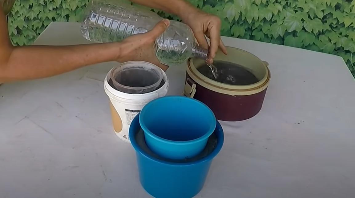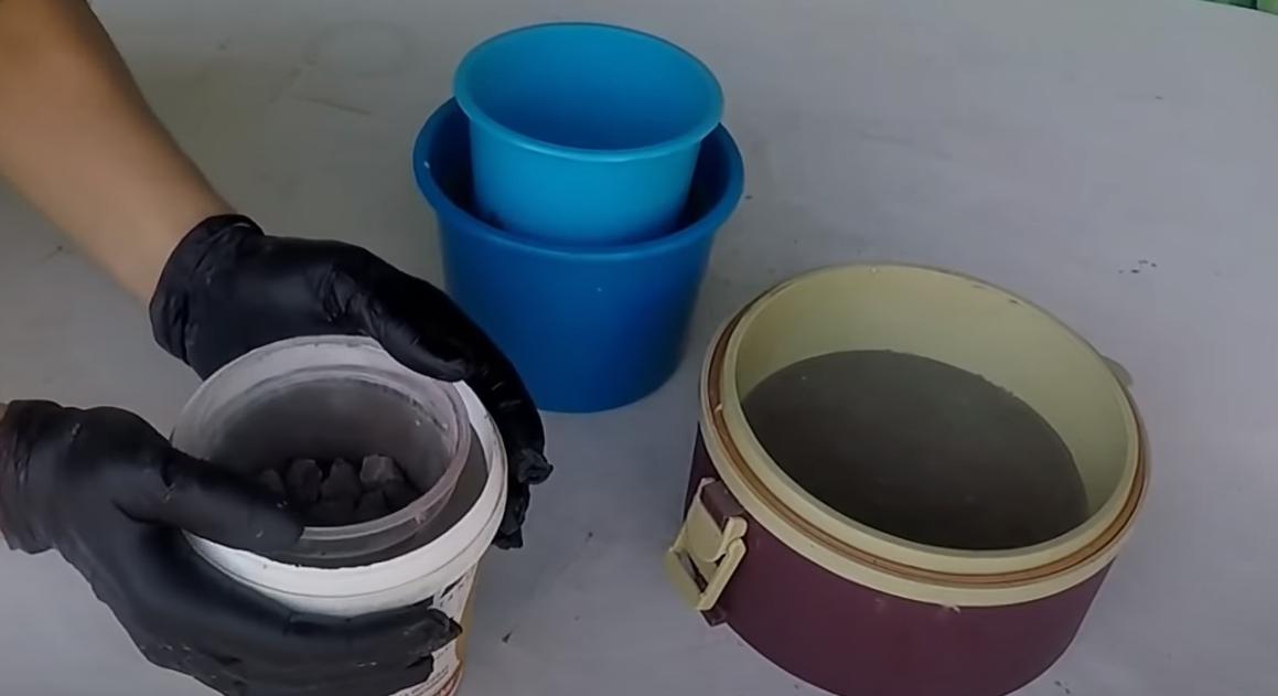 最后的成品是2個一大一小的花盆,一個花盆底座。找倆塑料桶,當(dāng)做花盆模具,將攪拌均勻的混合物,倒入3個塑料桶里,等到半干燥的程度即可。