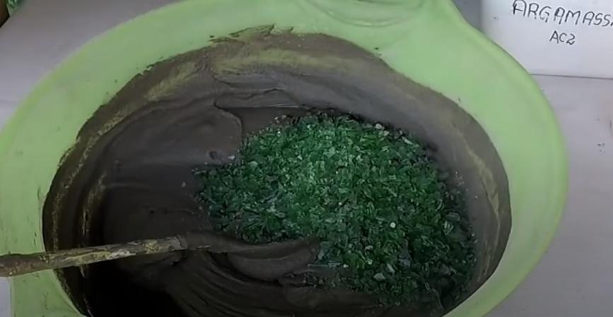 接下來是最重要的步驟:將提前弄碎的啤酒瓶碎粒子灑入盆里,可以選擇幾種顏色的啤酒瓶粒子進(jìn)行混合攪拌。