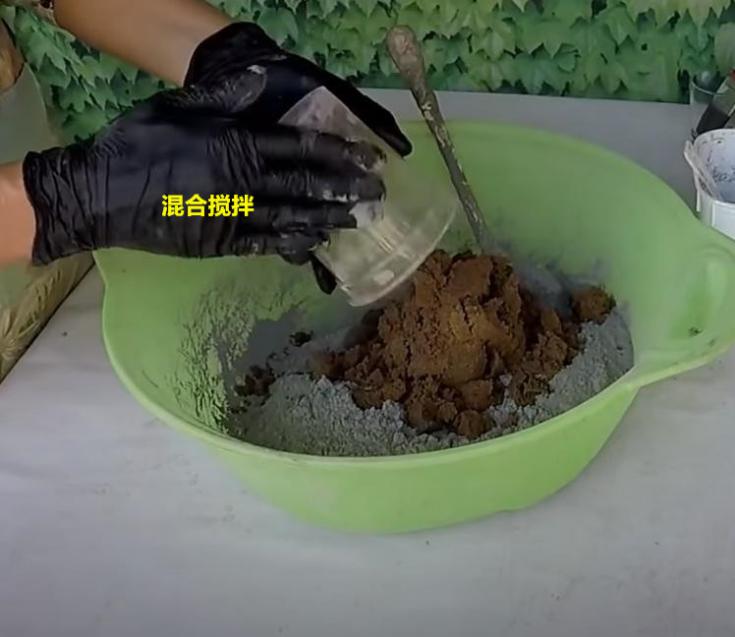將混凝土、細(xì)黃沙全都放在一個大盆里,給它充分?jǐn)嚢杈鶆?;接著在攪拌均勻的水泥里倒入適量的水充分?jǐn)噭颍WC水泥呈現(xiàn)糊狀。